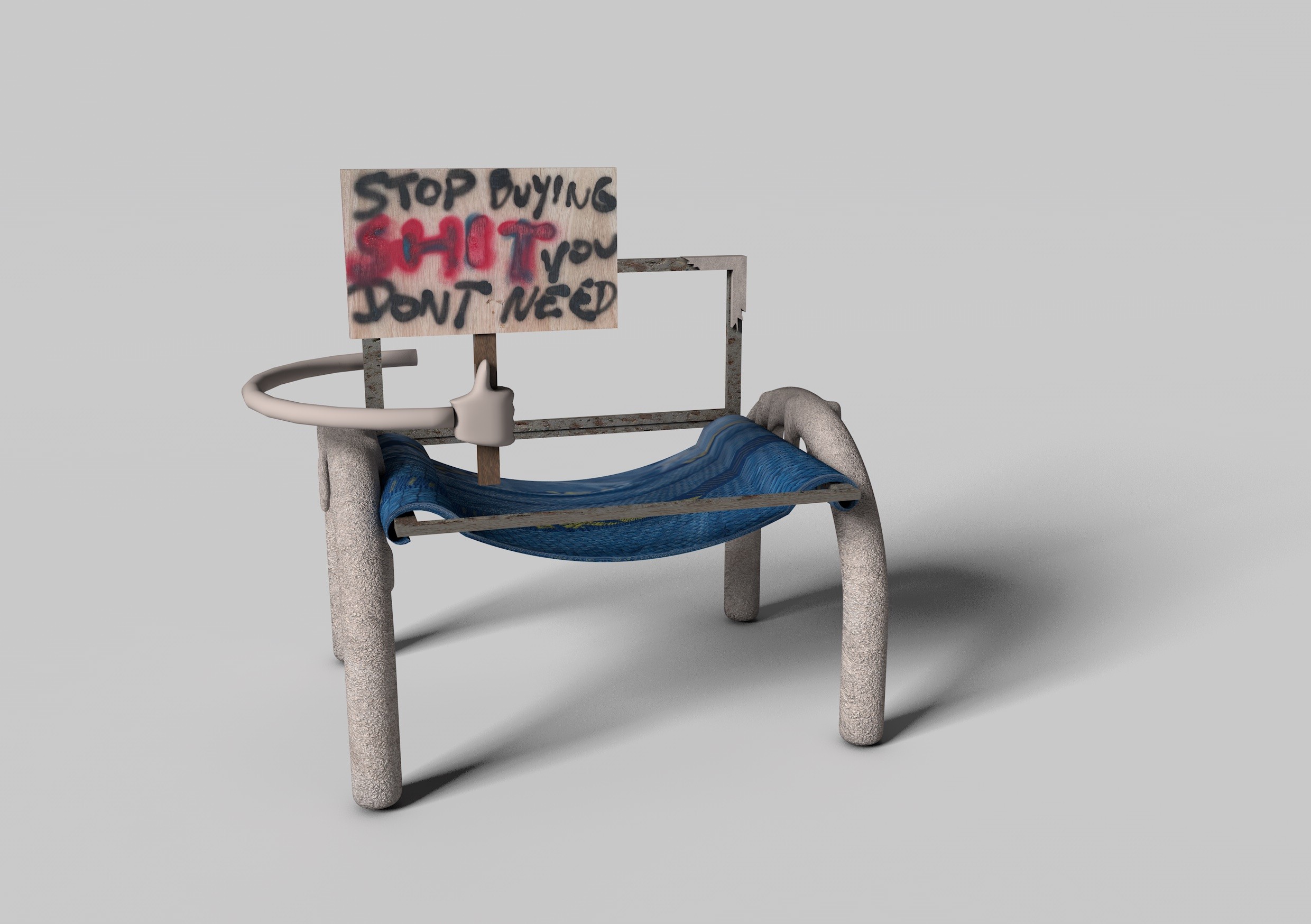 This chair's purpose is not to be a seat for us to sit on, but rather a statement that stands as a symbol of protest on its own. The legs, arms, and protest sign of the chair symbolize thrown furniture standing up for themselves by protesting. The corner with plaster symbolizes the forgotten "repair culture" since plaster is often used to fix broken arms in the form of a cast. Essentially, my goal is to place the chair in a protest environment against consumerism, or as a social experiment, placed in locations close to stores that promote consumerism.